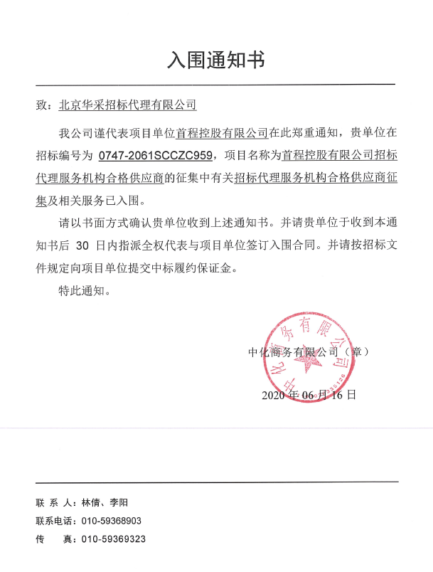 北京开云中国招标代理有限公司成功入围首程控股有限公司招标代理机构